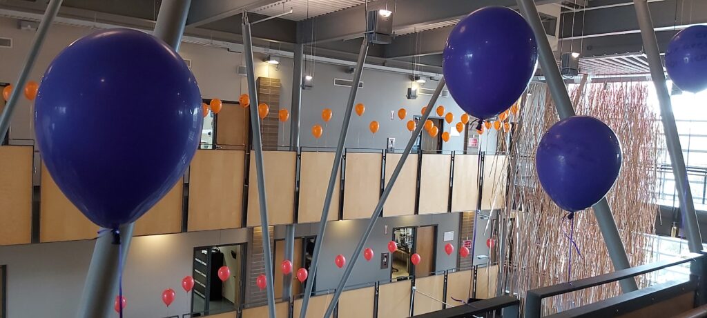 En effet, c’est confortablement assis dans leur classe respective que les élèves ont d’abord pu assister à des capsules de motivation offertes par M. Bruny Surin et M. Sylvain Guimond. Les sujets étaient axés sur la persévérance, ainsi que sur l’importance de maîtriser leurs pensées pour vaincre l’anxiété. Suite au visionnement, chaque élève a reçu un ballon gonflé à l’hélium aux couleurs de leur programme de formation. Tous ont été invités à y inscrire un souhait, un rêve ou ce qui les motive au quotidien puis sont allés attacher leur ballon dans le corridor faisant face au spectaculaire atrium du CFNT.