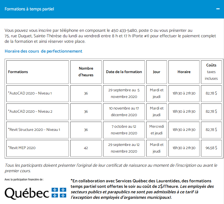 Avis aux employeurs et aux employés. En collaboration avec Services Québec des Laurentides, des formations temps partiel sont offertes le soir au coût de 2$/l’heure. Les employés des secteurs publics et parapublics ne sont pas admissibles à ce tarif.